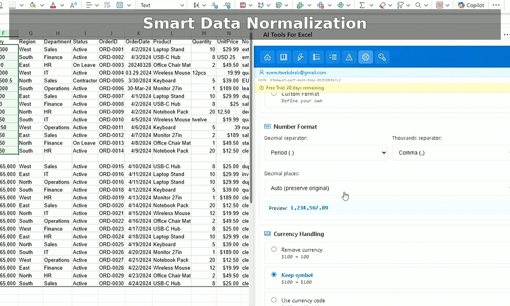 Describe what you want in plain language and AI creates the correct Excel formula instantly.Clean and Format Data