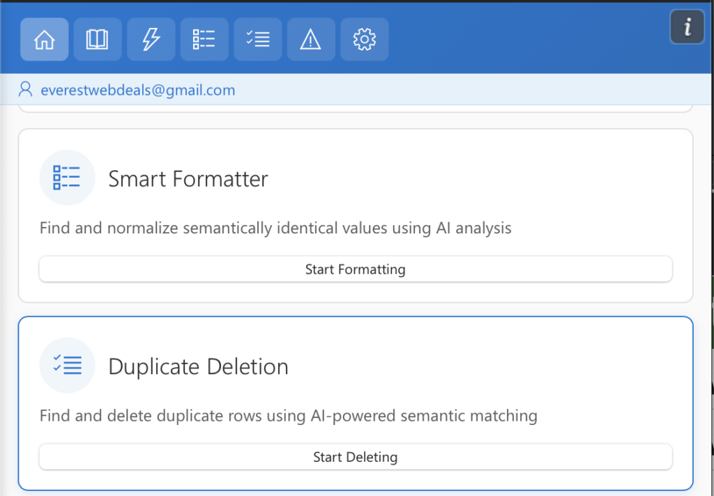 The Duplicate Deletion feature in AI Tools For Excel helps you remove duplicates in Excel quickly and accurately. This powerful Excel duplicate remover scans your worksheet to find duplicates in Excel and automatically delete duplicate rows in Excel using AI-powered semantic matching.