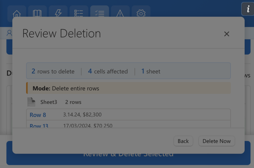 - Preview before deletion — review which rows will be kept or deleted before applying changes.