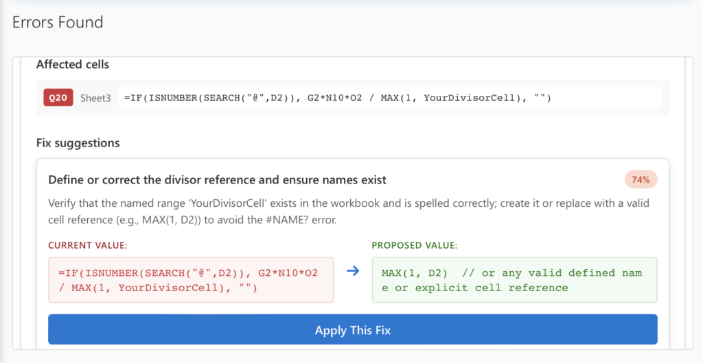 - AI-generated fix suggestions — recommended corrections for the formula or reference
